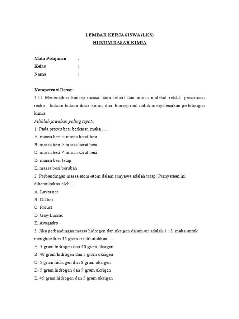 Apr 17 2018 Berikut adalah 11 soal pilihan ganda hukum dasar kimia dan pembahasannya. Sep 30 2020 Hukum Dasar Kimia Kelas 10 Hukum Dari Para Ahli Contoh Soalnya Quipper Blog Hukum perbandingan tetap proust sobat hitung kita lanjutkan kembali belajar kita mengenai hukum dasar kimia. K13 Revisi Antiremed Kelas 10 Kimia Hukum Dasar Perhitungan Kimia - Latihan Soal Doc.
