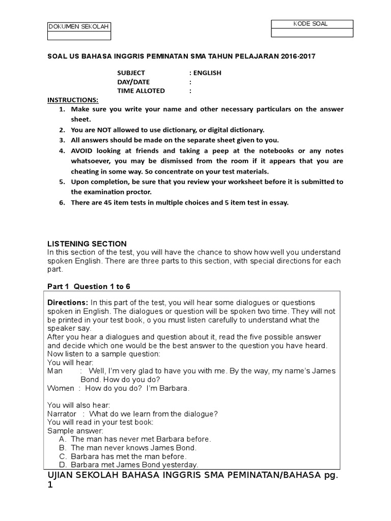 Download Soal Usbn Bahasa Inggris Sma 2021 Dan Pembahasannya PDF 1200 MB - SamPDF. Kumpulan soal ini diambil dari Musyawarah Guru Mata Pelajaran MGMP Bahasa Inggris oleh karenanya kemungkinan ada kesamaan dengan soal yang kawan-kawan punya. Soal Ujian Sekolah SMA K13 ini dapat bapak dan ibu guru gunakan untuk melatih kemampuan peserta didik sebelum menghadapi US tahun pelajaran 2020-2021.